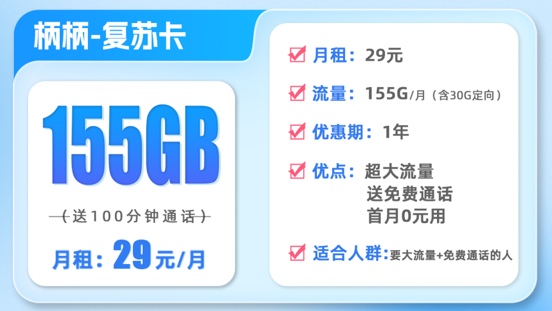 复苏卡有155G,在线下营业厅起码要179元才能办到这个套餐。29元/月能用一年,已经是运营商能放出的较大羊毛了。